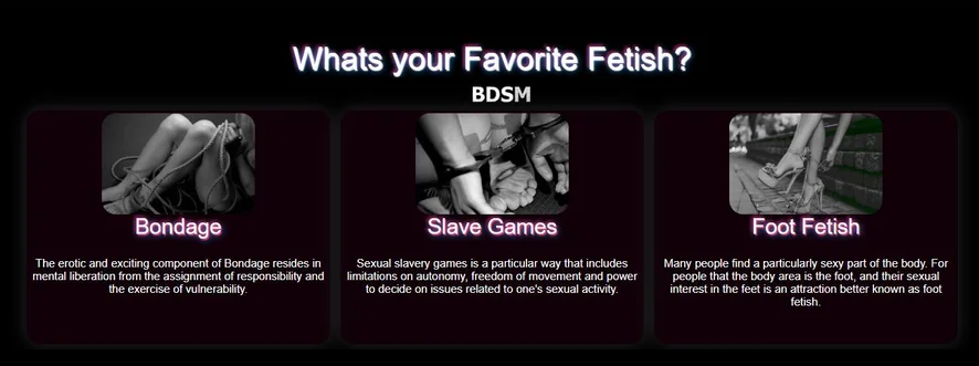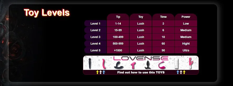 Líbání, Plácání po zadku, Erotický tanec, Prstění, Zezadu, Dvojitý průnik, Striptýz, Anální hračky, Anál, Špinavá mluva, Dildo nebo vibrátor, Zadkem k puse, Flexing, Exhibicionismus, Fisting, Sezení na obličeji, Kouření, Hardcore, Poloha 69, Olejová show, Nahoře bez, Polykání, Twerk